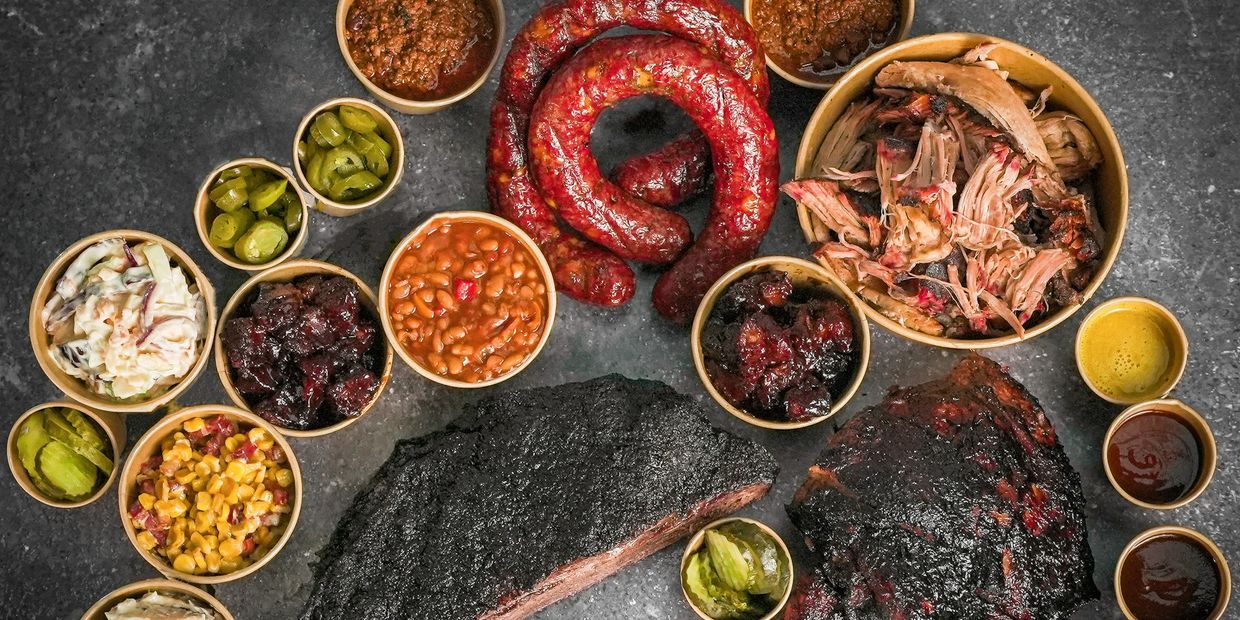 1/2 Brisket, Pulled Pork (1kg), 2x 1/2 Rack of Pork Ribs, 2x Jalapeño Sausage, 2x Pork Belly Burnt Ends, 4x Sides, 3x Pickles, 4x Sauces
